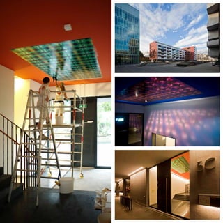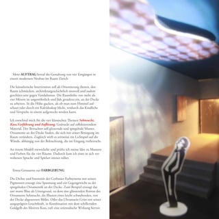 Michael Bühler gestaltete die Eingangsbereiche eines modernen Neubaus in Zürich mit künstlerischen Interventionen, die als Orientierung und Schmuck des Raumes dienen. Die Deckenarbeiten thematisieren Sehnsucht, Kuss, Verführung und Auflösung, indem sie reflektierende Materialien nutzen, die sich mit der Bewegung des Betrachters verändern und ein Spiel von Licht und Schatten erzeugen. Die Drucktechnik und Materialwahl gewährleisten dabei die Originalität und Haltbarkeit der Werke, die in enger Zusammenarbeit mit der Steindruckerei Wolfensberger entstanden sind.