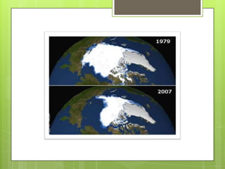 Die Präsentation behandelt die Folgen der Klimaerwärmung auf Natur und Tierwelt sowie deren wirtschaftliche und soziale Auswirkungen. Naturkatastrophen wie Hurrikane und Erdbeben werden betrachtet, ebenso die Bedrohung bestimmter Tierarten wie Eisbären durch den Klimawandel. Zudem werden die menschlichen Einflüsse auf die Erderwärmung und die psychischen Auswirkungen auf Menschen thematisiert.