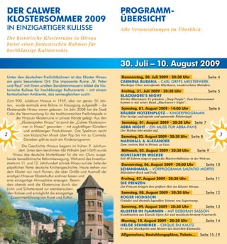 Vom 30. Juli bis 10. August 2009 findet im Kloster Hirsau der Calwer Klostersommer statt, der ein abwechslungsreiches kulturelles Programm bietet, einschließlich Aufführungen von Carl Orffs 'Carmina Burana', Konzerten von Ritchie Blackmore's Night, Konstantin Wecker und weiteren Künstlern. Die historische Kulisse des Klosters und ein Kinderprogramm mit dem Theaterstück 'Räuber Hotzenplotz' ergänzen die Veranstaltungen. Die Vielfalt reicht von klassischer Musik über Rock bis hin zu Comedy und Folk.
