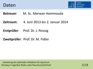 Die Bachelorarbeit von Maxim Penner behandelt die Herleitung des optimalen Detektors für Spectrum Sensing in Cognitive Radio unter Rauschunsicherheit. Es werden verschiedene Detektoren vorgestellt und deren Leistungsfähigkeit in Bezug auf Rauschunsicherheit und Korrelation untersucht, wobei Simulationen und Messergebnisse die Theorien bestätigen. Das Fazit hebt hervor, dass die Einbeziehung von Korrelation die Leistung der Detektoren verbessert, jedoch mit einem hohen Rechenaufwand verbunden ist.