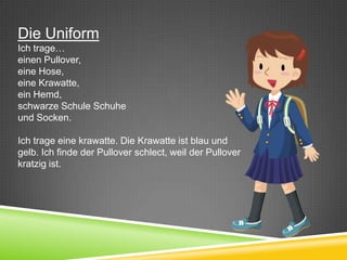 In dem Dokument beschreibt der Autor seine Schuluniform, die aus einem Pullover, einer Hose, einer Krawatte, einem Hemd und schwarzen Schuhen besteht, wobei er den Pullover als unangenehm empfindet. Sein Lieblingsfach ist Mathe, während er Geschichte als langweilig empfindet, teilt er auch seine Pausenverpflegung mit, die aus Cola, Wasser, einem Brötchen und einem Apfel besteht. Der Stundenplan zeigt, dass die Schule um 9 Uhr beginnt und am Freitag um halb vier endet.