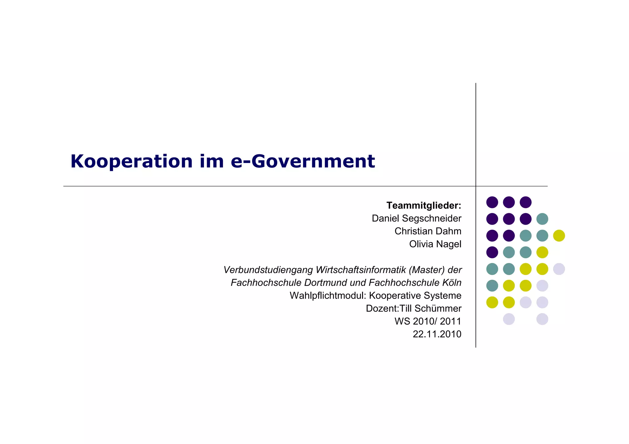 Das Dokument beschreibt das Wahlpflichtmodul 'Kooperative Systeme' im Kontext des E-Governments, welches von einer Gruppe von Studierenden und ihrem Dozenten durchgeführt wurde. Es thematisiert die Motivation zur Kooperation im öffentlichen Dienst, aktuelle Systeme zur Unterstützung von IT-Projekten, sowie verschiedene Anwendungsbeispiele zur Registrierung und Nutzung der 'komit'-Plattform. Zudem werden wichtige Patterns zur Unterstützung der Zusammenarbeit und Kommunikation innerhalb von Projektteams aufgeführt.