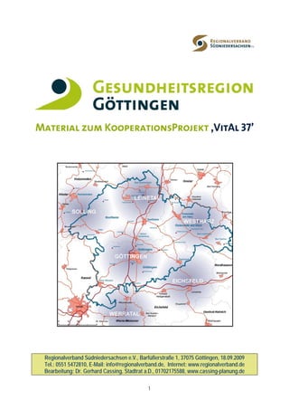 Das Dokument thematisiert das Kooperationsprojekt 'vital 37', das auf die Ausbildung in der Gesundheitswirtschaft und den Erhalt der Gesundheit im Alter abzielt. Es beschreibt die Initiativen zur Bildung eines regionalen Netzwerks in der Gesundheitsregion Göttingen, um die Gesundheitsversorgung, Forschung und wirtschaftliche Entwicklung zu fördern. Die Regionalpolitik will die regionale Gesundheitswirtschaft stärken und als führenden Bereich im internationalen Wettbewerb positionieren.