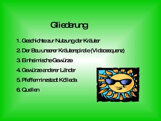 Das Dokument bietet einen umfassenden Überblick über einheimische Kräuter und Gewürze, einschließlich ihrer Geschichte, Anbau und Verwendung. Es enthält spezifische Informationen über verschiedene Kräuter, deren lateinische Namen, Familienzugehörigkeit, Vorkommen, Struktur und Heil- oder Kochanwendungen. Außerdem wird die traditionelle Verwendung und der Einfluss von Kräutern im mittelalterlichen Europa behandelt sowie Hinweise auf einige importierte Gewürze.
