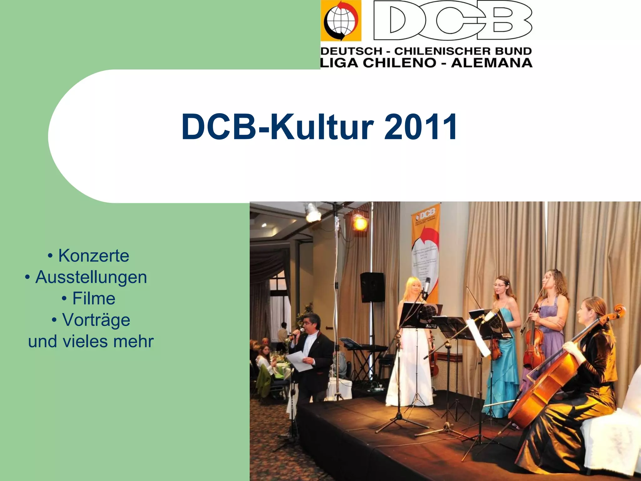 Das Dokument beschreibt die kulturellen Aktivitäten der dcb-kultur im Jahr 2011, darunter Konzerte, Ausstellungen, Filme und Vorträge in Zusammenarbeit mit verschiedenen Institutionen und Künstlern. Geplante Veranstaltungen umfassen Aufführungen von Chören, Orchester und Filmvorführungen sowie Ausstellungen mit zahlreichen Teilnehmern. Zudem gibt es einen Ausblick auf weitere Aktivitäten und Projekte für 2012.