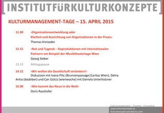Das Dokument beschreibt die Kulturmanagement-Tage 2015 in Wien, die eine Vielzahl von Veranstaltungen und Diskussionen zu Themen wie unternehmerisches Handeln in der Kultur, Weiterbildung und Arbeitsbedingungen im Kulturbereich umfassen. Es betont die Bedeutung von Weiterbildung, persönliche Entwicklung und die Rolle von Kulturorganisationen in gesellschaftlichen Veränderungen. Darüber hinaus werden verschiedene Zertifikatslehrgänge im Bereich Kulturmanagement und Kulturvermittlung angeboten, um Fachkompetenzen zu fördern.