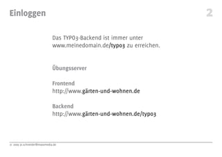 Das Dokument beschreibt die grundlegenden Funktionen und Benutzeroberfläche des TYPO3-Backends, einschließlich der Anmeldung, Bildschirmaufteilung, Benutzereinstellungen und Seitenbearbeitung. Es wird erläutert, wie Inhalte erstellt, bearbeitet und verwaltet werden können, sowie die Nutzung von verschiedenen Inhaltstypen und Erweiterten Ansichten. Zudem werden Shortcut-Funktionen und Empfehlungen für Bildgrößen auf der Website gegeben.