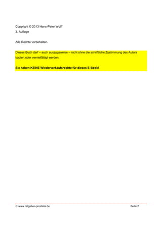Der Ratgeber behandelt Prostataerkrankungen, einschließlich Prostatitis, gutartiger Prostatavergrößerung (BPH) und Prostatakrebs, sowie deren Symptome, Diagnosemethoden und Behandlungsmöglichkeiten. Besondere Beachtung finden alternative Therapieansätze und Ernährungstipps zur Verbesserung der Prostatagesundheit. Der Autor nutzt persönliche Erfahrungen, um wichtige Informationen und Empfehlungen für Betroffene bereitzustellen.