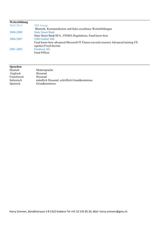 Harry Simmen ist ein erfahrener Senior Sales und Relationship Manager mit umfangreicher Expertise in Fond-Operations und Projektmanagement. Er betont seine kunden- und ergebnisorientierte Persönlichkeit sowie seine Fähigkeit, unterschiedliche Persönlichkeiten in erfolgreichen Teams zu vereinen. Zudem verfügt er über umfassende Kenntnisse in verschiedenen Rollen innerhalb der Finanzbranche und hat an mehreren Weiterbildungen in den Bereichen Kommunikation und Finanzregulierung teilgenommen.