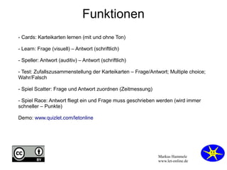 Das Dokument beschreibt die Funktionen und Anwendungsgebiete von Quizlet, insbesondere für das Lernen von Sprachen und die Nutzung digitaler Karteikarten. Es hebt sowohl die Vorteile für Anwender und Autoren hervor als auch einige Nachteile, wie die Notwendigkeit einer Anmeldung für Bestenlisten und die Einschränkungen bezüglich der Bildnutzung. Zudem wird der Einsatz von Quizlet in Live-Online-Events zur Wissensüberprüfung und Auflockerung thematisiert.