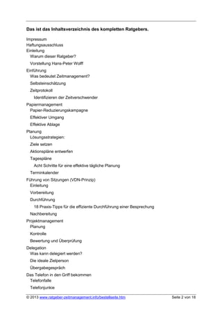 Der Ratgeber von Hans-Peter Wolff zum Zeitmanagement bietet Methoden und Strategien zur effektiven Zeitnutzung und Selbstorganisation, mit dem Ziel, Stress zu reduzieren und die Lebensqualität zu verbessern. Er führt Techniken zur Zielsetzung, Priorisierung, Delegation und den Umgang mit Zeitverschwendern auf, darunter die ABC-Analyse, ALPEN-Methode und das Eisenhower-Prinzip. Der Autor betont die Wichtigkeit eines strukturierten Ansatzes zur Zeitverwaltung, um bessere Ergebnisse zu erzielen und den persönlichen und beruflichen Erfolg zu steigern.