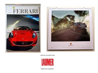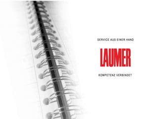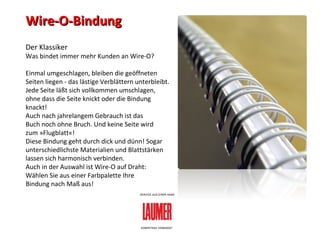Das Dokument beschreibt verschiedene Bindungsarten für Druckprodukte, wie Wire-O-Bindung, Spiralbindung und Leinenfälzel, sowie deren Vorteile wie Langlebigkeit und Flexibilität. Es wird auf die Anwendungsmöglichkeiten dieser Bindungen in Kalendern und Broschüren hingewiesen. Laumer GmbH + Co. KG bietet zudem einen Beratungs- und Versandservice sowie Sonderanfertigungen an.