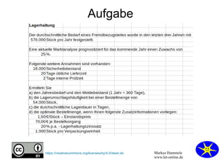 Das Dokument enthält Informationen zu einer Aufgabe in der Lagerhaltung, die von Markus Hammel erstellt wurde. Es bietet sowohl die Aufgabenstellung als auch die dazugehörige Lösung an. Die Lizenzinformationen sind ebenfalls im Dokument enthalten.