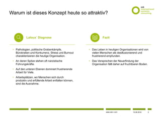 Das Konzept der evolutionären Organisation von Frederic Laloux adressiert die Herausforderungen in modernen Arbeitsumgebungen, die häufig von Frustration und stressbedingten Pathologien geprägt sind. Es betont die Notwendigkeit für sinnstiftende Strukturen und selbstführende Teams, während es Anreize zur Überprüfung traditioneller Praktiken bietet. Gleichzeitig äußern sich Bedenken über die Abhängigkeit von starken Führungspersönlichkeiten und kulturelle Hürden, die die Umsetzung erschweren könnten.