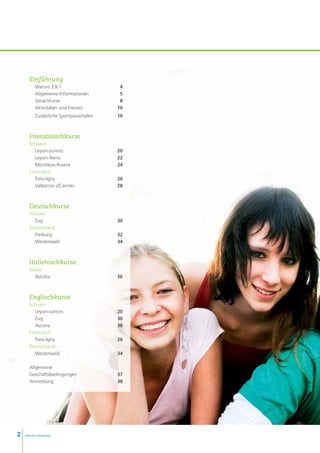 Das Dokument beschreibt die ESL-Sprachkurse für Kinder und Jugendliche im Alter von 8 bis 17 Jahren, die in verschiedenen Ländern wie der Schweiz, Frankreich und Deutschland angeboten werden. Die Programme bieten eine hohe Unterrichtsqualität in einem sicheren und familiären Umfeld, ergänzt durch vielfältige Freizeitaktivitäten und sportliche Möglichkeiten. Teilnehmer lernen nicht nur eine neue Sprache, sondern knüpfen auch internationale Freundschaften und erleben kulturellen Austausch.