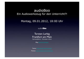 Das Dokument beschreibt audioboo, ein einfach nutzbares Tool zur Erstellung von Podcasts, das besonders im Bildungsbereich vorteilhaft ist. Es thematisiert den Wandel von analog zu digitalem Lernen und die Vorteile von audioboo, wie die Mobilität und die soziale Komponente des Mediums. Neben praktischen Beispielen und einer Diskussionsanregung wird auf die Zugänglichkeit von Podcasts und die Möglichkeit, audioboo-Inhalte über iTunes anzubieten, eingegangen.