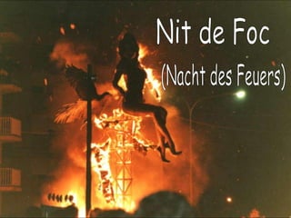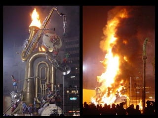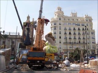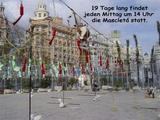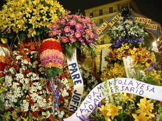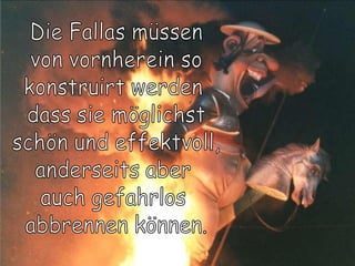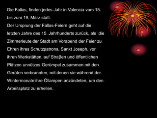 Die Fallas sind ein jährlich in Valencia vom 15. bis 19. März stattfindendes Fest, das seinen Ursprung im 15. Jahrhundert hat und heute mehr als 300 kunstvoll gestaltete Holzkonstruktionen umfasst, die oft satirische Szenen darstellen. Täglich finden große Feuerwerke statt, und das Fest gipfelt in der Verbrennung der Fallas in der Nacht vom 19. auf den 20. März, während zahlreiche Feierlichkeiten, Umzüge und Wettbewerbe den traditionellen Charakter des Festes unterstreichen. Ein wichtiger Bestandteil ist das Blumenopfer zu Ehren der Stadtpatronin, bei dem prächtige Blumensträuße zur Kathedrale gebracht und in eine farbenfrohe Hommage verwandelt werden.