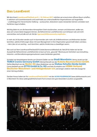 Das Event 'LeanAroundTheClock' findet am 9. und 10. Februar 2017 in der Alten Feuerwache in Mannheim statt und bietet eine Plattform für den Austausch und das Networking von Lean-Interessierten aus verschiedenen Organisationen. Mehr als 24 Referenten werden ihre Erfahrungen mit Lean Management teilen und dabei auf Herausforderungen eingehen, während die offene Atmosphäre und die niedrige Teilnahmegebühr von 150 Euro plus Mehrwertsteuer zur Teilnahme anregen. Aussteller haben die Möglichkeit, sich zu präsentieren, und eine begrenzte Anzahl an Ausstellungsflächen steht zur Verfügung.