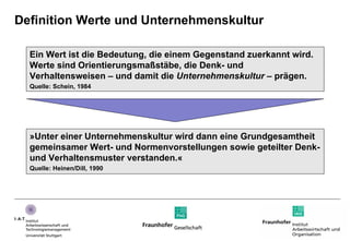 Das Dokument würdigt den 65. Geburtstag von Prof. Dr.-Ing. Peter Kern und thematisiert die Bedeutung von Werten und Unternehmenskultur, die die Denk- und Verhaltensweisen prägen. Es werden universelle Werte und zentrale Werte am Fraunhofer IAO hervorgehoben, während die Entwicklung von Kern's Karriere und seinen Beiträgen zur Institution im Laufe der Jahre skizziert wird. Die zentrale Botschaft betont, dass Werte durch Innovation und Kundenorientierung geschaffen werden.