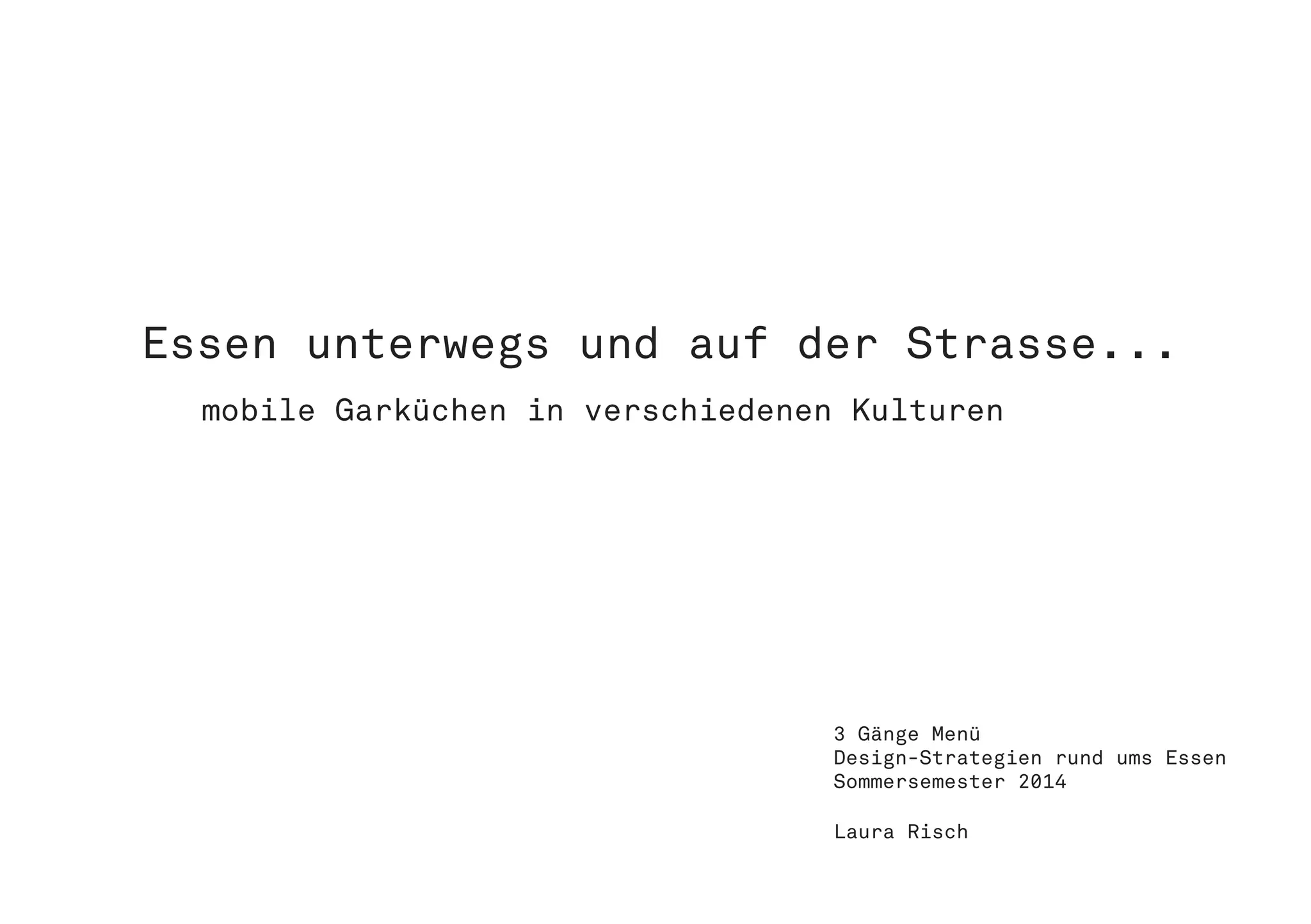 Das Dokument behandelt die Geschichte und Entwicklung von Garküchen als Vorläufer der modernen Gastronomie, beginnend in der Antike bis zur heutigen Nutzung in verschiedenen Kulturen. Es vergleicht die Straßenküchen in Asien und Afrika mit Imbissen in Nordamerika und Europa und listet typische Gerichte aus verschiedenen Ländern auf. Außerdem werden Design-Strategien für die Präsentation eines 3-Gänge-Menüs in diesem Kontext diskutiert.