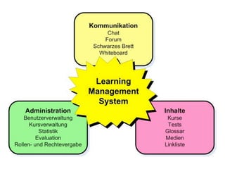 Das Dokument beschreibt Lernmanagementsysteme (LMS) als webbasierte Plattformen zur Verwaltung und Bereitstellung von Lerninhalten sowie zur Unterstützung von Online-Seminaren und Kommunikation. Es werden technische Anforderungen und Beispiele für LMS-Systeme wie Blackboard und Moodle genannt, sowie deren Funktionen und Nutzungszahlen an der TU Graz. Abschließend werden Überlegungen zur Auswahl und den notwendigen Funktionalitäten von LMS angestellt.