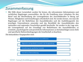Das Dokument beschreibt die Planung und Vorbereitung von Ausbildungseinheiten im Rahmen eines Erasmus+-Projekts, insbesondere die Definition von Lernzielen nach dem SMART-Modell. Es wird erläutert, wie Ausbilder die individuellen Lernbedürfnisse der Auszubildenden ermitteln und spezifische Lernziele festlegen können, um eine qualitativ hochwertige, praxisorientierte Ausbildung zu gewährleisten. Zudem werden die Unterschiede zwischen allgemeinen und spezifischen Lernzielen sowie die Bedeutung dieser Ziele für die Gestaltung des Ausbildungsprozesses hervorgehoben.