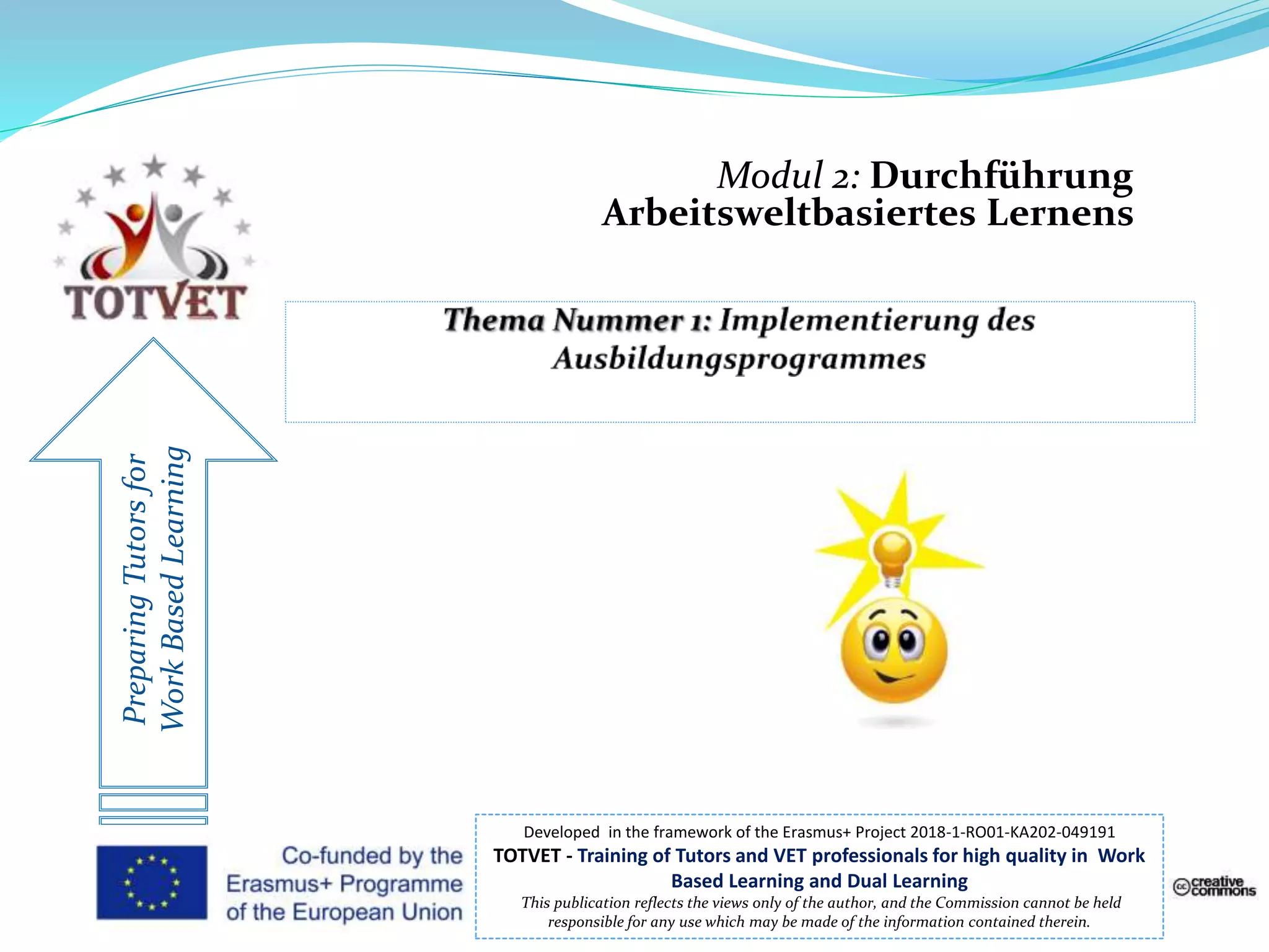 Das Dokument beschreibt die Durchführung arbeitsweltbasierten Lernens im Rahmen eines Erasmus+-Projekts, fokussiert auf die wichtige Rolle der Ausbilder bei der Implementierung von Lehrplänen und der Bewertung von Lernfortschritten. Es hebt die Notwendigkeit hervor, die Qualität der Aktivitäten zu überprüfen und kommunikationsfördernde Methoden zu verwenden, um das Engagement der Lernenden zu steigern. Zudem werden Empfehlungen zur Anpassung von Ausbildungsplänen und zur kontinuierlichen Programmüberwachung gegeben, um sicherzustellen, dass die Ausbildungsziele erreicht werden.