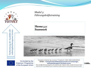 Das Dokument ist ein Leitfaden für betriebliche Ausbilder im Rahmen eines Erasmus+-Projekts und konzentriert sich auf die Entwicklung von Führungs- und Teamarbeitfähigkeiten. Es thematisiert die Rolle des Ausbilders als Führungskraft, die Motivation von Auszubildenden und die Bedeutung von Teamarbeit, einschließlich der Identifizierung von Teamrollen nach Belbin. Weiterhin wird betont, wie wichtig es ist, die verschiedenen Funktionen des Ausbilders zu verstehen, um die Auszubildenden effektiv zu unterstützen und ihre Motivation aufrechtzuerhalten.