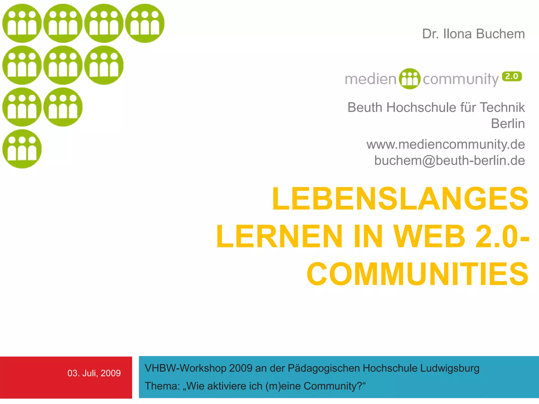Der Workshop von Dr. Ilona Buchem thematisiert lebenslanges Lernen (LLL) und dessen Unterstützung durch Web 2.0-Communities, wobei verschiedene Perspektiven auf LLL betrachtet werden. Zudem werden Modelle und Strategien zur Förderung von LLL in der Druck- und Medienbranche vorgestellt, einschließlich der Nutzung von kollaborativen Lernplattformen. Abschließend wird die Beteiligung der Community analysiert, indem die 90-9-1 Regel für aktive und passive Nutzer in sozialen Communities erläutert wird.