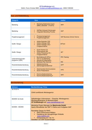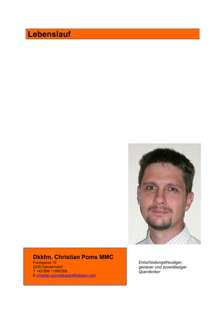 Christian Poms ist ein erfahrener Werbegrafikdesigner und Unternehmer mit umfangreicher Ausbildung in Marketing, Projektmanagement und Grafikdesign. Er hat in verschiedenen Positionen, einschließlich Marketing Project Manager bei SAP Österreich, gearbeitet und ist für Corporate Branding, interne Kommunikation und Veranstaltungsorganisation verantwortlich. Poms verfügt über Kenntnisse in verschiedenen Softwareprogrammen, einschließlich Adobe Creative Suite und SAP-Systemen.