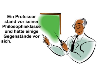 Ein Professor demonstriert mit einem Blumentopf und verschiedenen Gegenständen die Wichtigkeit der Prioritäten im Leben. Die Golfbälle repräsentieren die wesentlichen Dinge wie Familie und Gesundheit, die Kieselsteine steht für bedeutende, aber weniger wichtige Dinge, während der Sand für Kleinigkeiten steht. Er betont, dass man zuerst die wichtigen Dinge in den Mittelpunkt stellen sollte und schließt mit der Aussage, dass es immer Raum für ein paar Freudenmomente gibt, symbolisiert durch Bier.