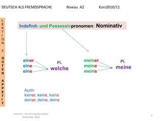 Das Dokument bietet eine Übersicht über den Deutschunterricht auf Niveau A2, speziell zu indefiniten und possessiven Pronomen im Nominativ und Akkusativ sowie wichtige Wendungen für Restaurantbesuche. Es enthält praktische Beispiele für die Verwendung von Pronomen und Phrasen, die im Gespräch mit Kellnern und beim Bestellen von Speisen und Getränken nützlich sind. Die Lektionen sind von der Lehrerin Ana Fernández Soliño verfasst und datieren auf November 2010.
