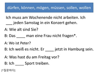 Die Lektion behandelt die Verwendung der Modalverben 'dürfen', 'können', 'mögen', 'müssen', 'sollen' und 'wollen' im Deutschen in verschiedenen Kontexten. Es werden alltägliche Situationen wie das Programm am Wochenende, der Besuch von Konzerten und Theatern sowie Fragen zu Freizeitaktivitäten und persönlichen Interessen thematisiert. Die Lektion enthält auch Übungsfragen zur Festigung des Gelernten.