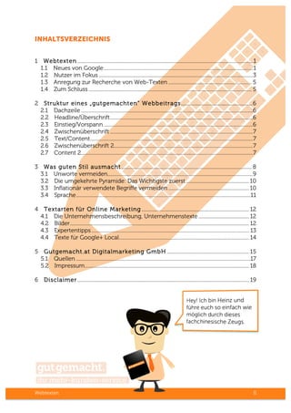Das Dokument bietet umfassende Tipps und Tricks zum Webtexten, betont die Wichtigkeit von ansprechenden, einzigartigen Inhalten und der natürlichen Verwendung von Keywords, um potenzielle Kunden zu gewinnen. Es hebt hervor, dass die Ausrichtung auf die Nutzerintention und die Bereitstellung von Mehrwert der Schlüssel zu erfolgreichem Online-Marketing sind. Bereitschaft zur Anpassung an aktuelle Google-Updates, wie das Hummingbird-Update, ist entscheidend für die Sichtbarkeit der Inhalte.