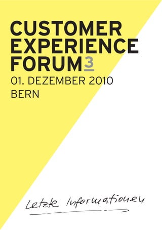 Das Dokument beschreibt das bevorstehende CX-Forum von Swisscom, bei dem Designmethoden und Herausforderungen diskutiert werden. Es betont die Bedeutung von human centered design und vermeldet verschiedene Fallstudien und Workshops, die im Rahmen der Veranstaltung präsentiert werden. Zudem wird auf ein Vorabendprogramm sowie Möglichkeiten zur Vernetzung und Diskussion während des Forums hingewiesen.