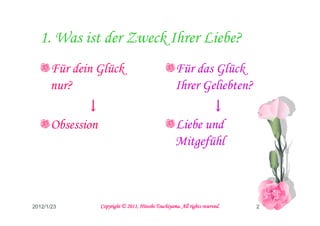Das Dokument behandelt die verschiedenen Facetten von Liebe, einschließlich ihrer Abhängigkeit von Selbstzielen oder altruistischen Absichten. Es wird zwischen besitzergreifender Liebe und mitfühlender Liebe unterschieden und betont, dass wahre Liebe auf bedingungsloser Fürsorge für das Wohl anderer basieren sollte. Zudem werden Fragen aufgeworfen, die dazu anregen, die eigene Liebe und deren Motivation zu reflektieren.
