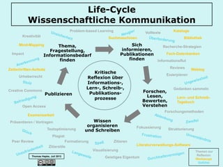 Das Dokument behandelt den Lebenszyklus der wissenschaftlichen Kommunikation, einschließlich der Phasen von Informationsbeschaffung, Forschung, Schreiben und Publizieren. Es thematisiert auch den kritischen Umgang mit Informationen, die Anwendung von Zitierstilen sowie den Schutz geistigen Eigentums. Zudem werden verschiedene Werkzeuge und Strategien für die effektive Recherche und Präsentation von wissenschaftlichen Arbeiten vorgestellt.