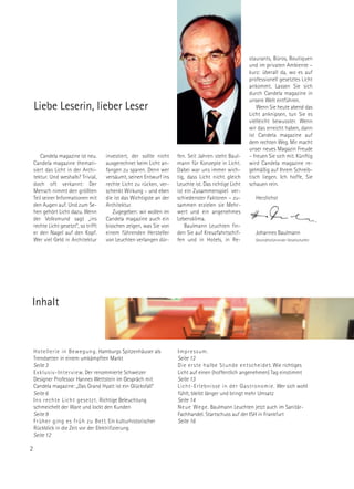 Das Candela Magazin präsentiert Neuigkeiten und Trends aus der Welt des Lichts und der Architektur, wobei es die Bedeutung der richtigen Beleuchtung für das Wohlbefinden in gastronomischen und hotelärchtigen Umgebungen betont. Es bietet Einblicke in innovative Lichtdesigns und -technologien sowie die Rolle von prominenten Designern wie Hannes Wettstein, der über seine Philosophie und Projekte im Bereich Lichtgestaltung spricht. Zudem wird die Entwicklung und das Design von Baulmann Leuchten hervorgehoben, welche in unterschiedlichen Anwendungskontexten, wie in Hotels oder Geschäften, zum Einsatz kommen.