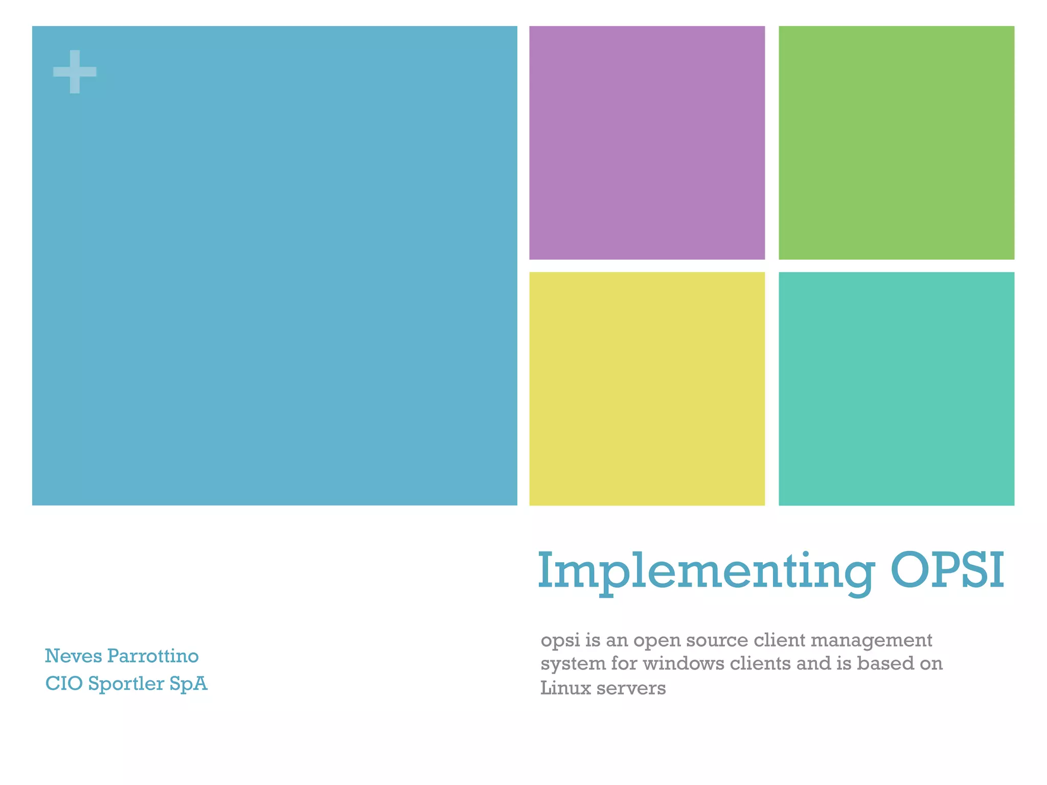 Opsi ist ein Open-Source-Client-Management-System für Windows-Clients, das auf Linux-Servern basiert. Es ermöglicht eine zügige Umsetzung von Anforderungen wie unbeaufsichtigte Installation, softwarebasierte Verwaltung und Patchmanagement bei überschaubaren Kosten. Der Projektabschluss zeigt einen Total Cost of Ownership von 68 € und einen Return on Investment innerhalb des ersten Jahres von 33 Wochen.