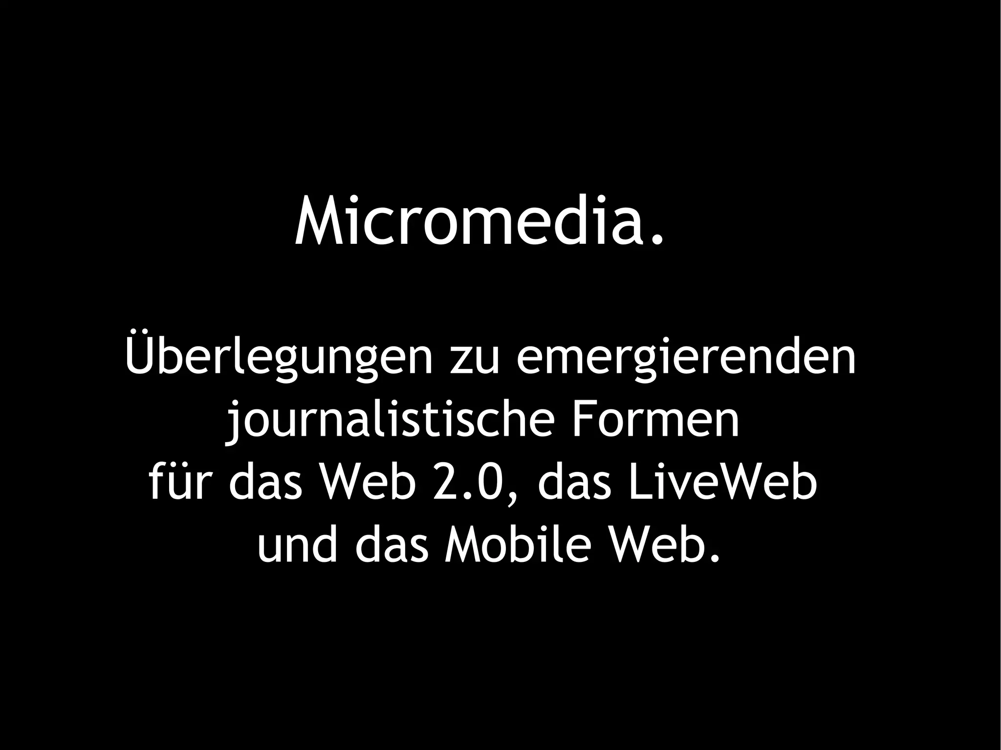 Das Dokument diskutiert emergierende journalistische Formen im Web 2.0, Live-Web und mobilem Web und betont die Bedeutung von 'Microcontent', der in kleinen, leicht verdaulichen Einheiten präsentiert wird. Anil Dash und David Weinberger argumentieren, dass die digitale Medienwelt sich in einer Richtung entwickelt, die die traditionellen Massenmedien überwinden könnte, indem sie eine Vielzahl von Informationen in kompakten Formaten bietet. Die neue Ära der 'Micromedia' erfordert multi-fokussierte Aufmerksamkeit und eine Anpassung der Medienformate an kleinere Bildschirme und Eigenschaften der digitalen Umgebung.