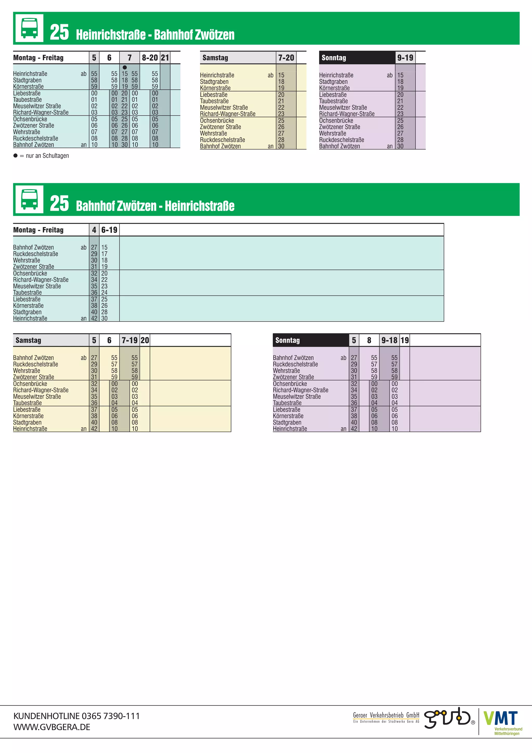 Das Dokument enthält Kontaktdaten und eine URL für die GVB Gera, einschließlich der Kundenhotline und der Adressen Bahnhof Zwötzen und Heinrichstraße.
