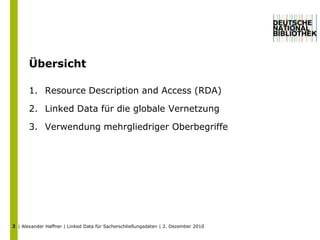 Das Dokument behandelt die Konzepte von Linked Data und Resource Description and Access (RDA) für die Katalogisierung und Vernetzung von Bibliotheksdaten. Es beschreibt die Ziele des Semantic Web, die Harmonisierung bibliografischer Standards und die Verwendung von mehrgliedrigen Oberbegriffen sowie die Herausforderungen im Bereich der Datensicherheit und Zuverlässigkeit. Zudem werden spezifische Beispiele und Modelle wie FRBR und FRAD zur Beschreibung von Entitäten und deren Beziehungen erläutert.