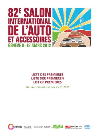 Das Dokument listet verschiedene Fahrzeugpremieren auf, darunter weltweite, europäische und schweizerische Premieren für PKWs, Elektrofahrzeuge, spezielle Karosserien, Accessoires, OEM und Werkstattinstallationen. Es definiert die Kriterien für Welt-, Europa- und Schweizerpremieren und bietet spezifische Details zu den vorgestellten Automodellen und deren technischen Spezifikationen. Zusätzlich enthält es Kontaktdaten für weitere Informationen zu den präsentierten Fahrzeugen.