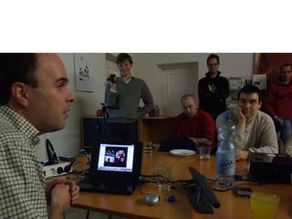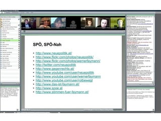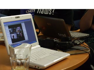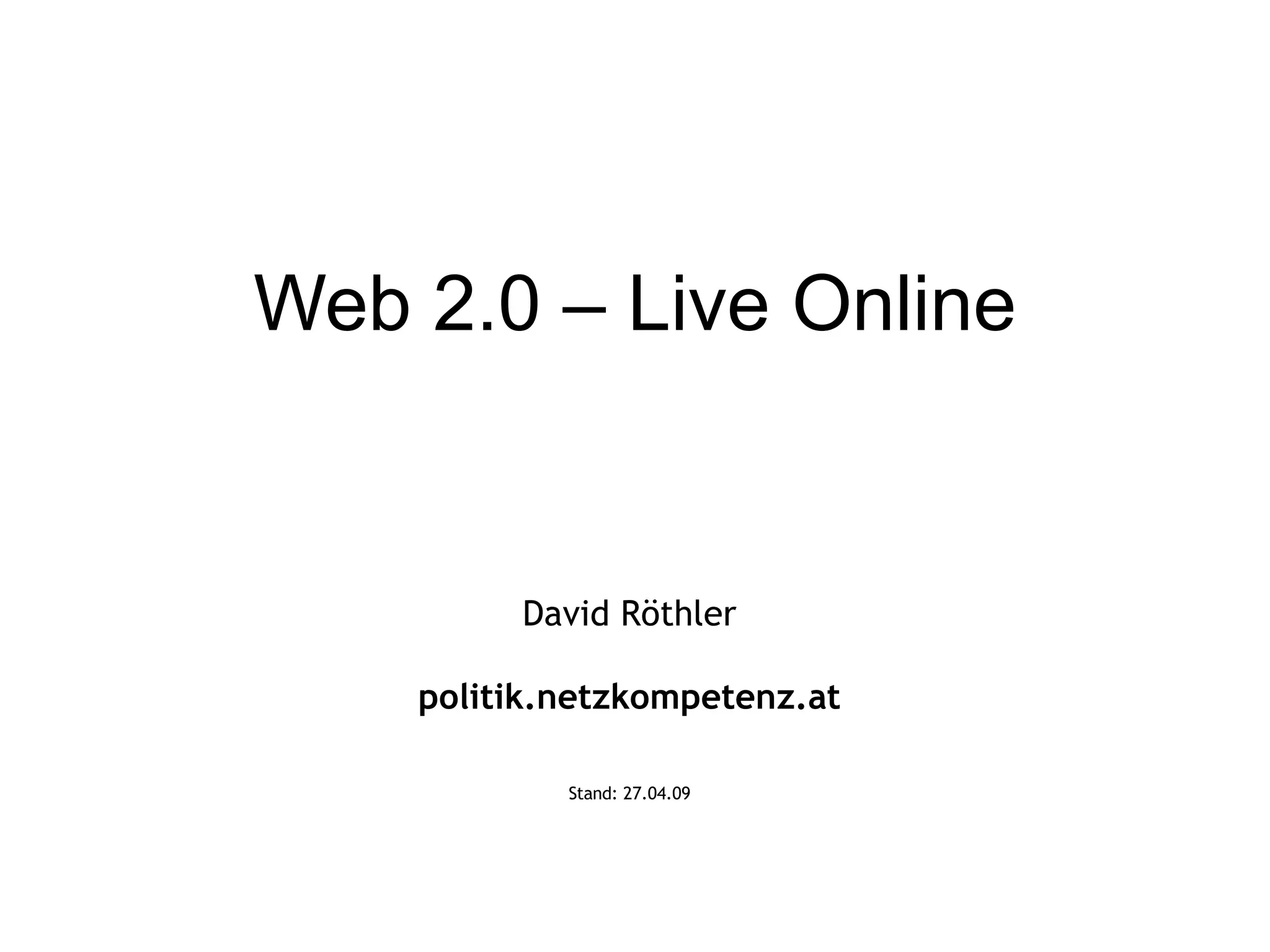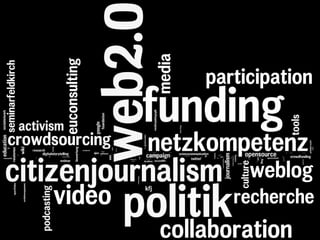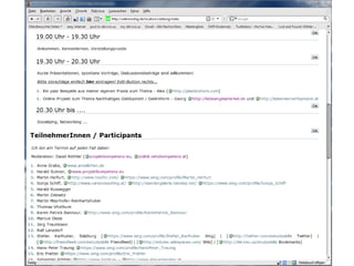 Das Dokument behandelt die Umwandlung des Rundfunks in einen Kommunikationsapparat nach Bertolt Brecht und thematisiert die Prinzipien von Web 2.0 wie Partizipation und Vernetzung, die zunehmend auch offline Anwendung finden. Es beschreibt verschiedene Einsatzmöglichkeiten von Web 2.0 in Schulen, um den Austausch und das Lernen zu fördern. Zudem werden Formate wie Barcamps und deren erfolgreiches Prinzip der offenen Teilnahme und Selbstorganisation vorgestellt.