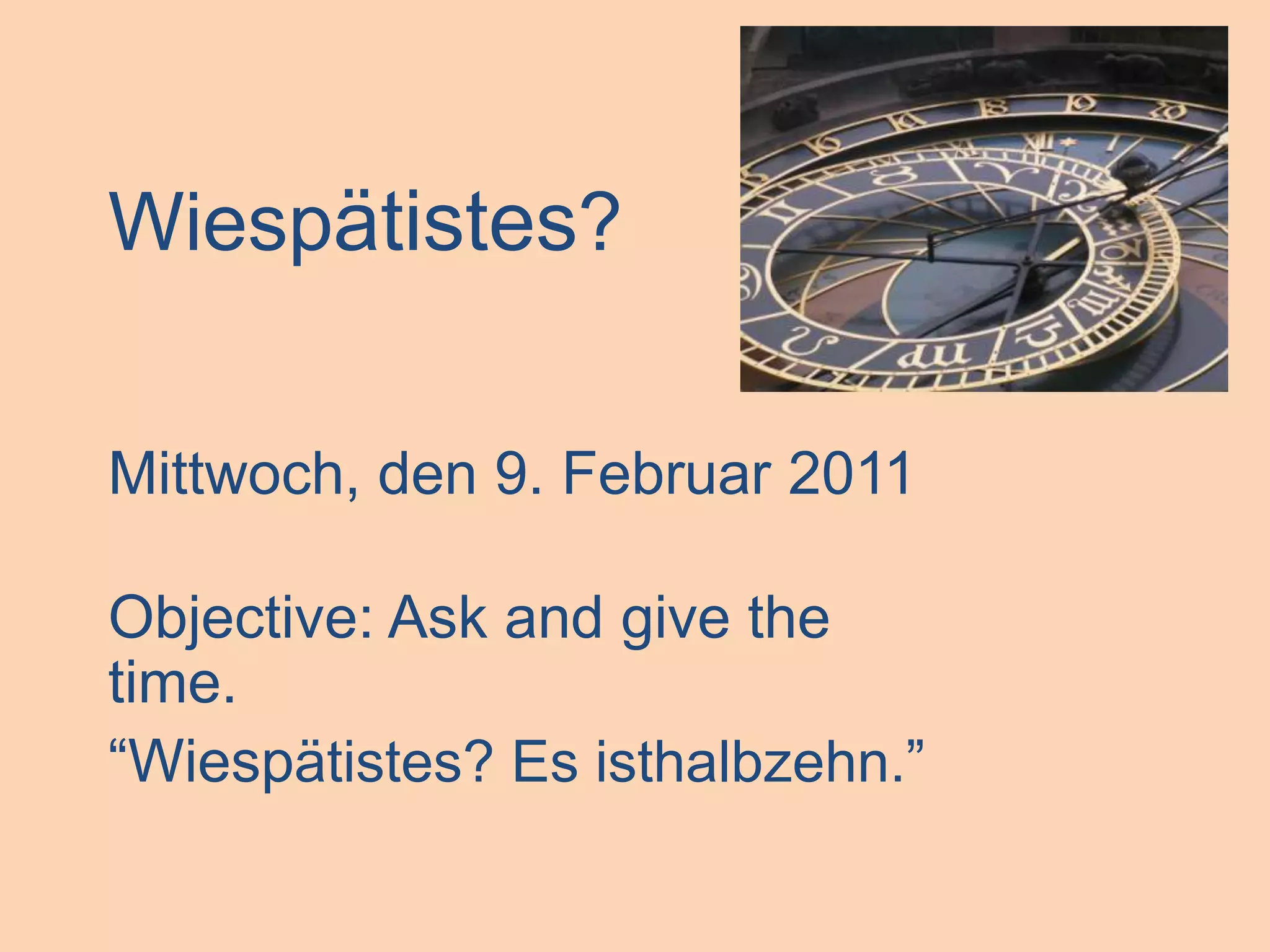 Das Dokument befasst sich mit dem Thema Zeitangaben auf Deutsch. Es enthält verschiedene Fragen und Antworten zur Uhrzeit sowie Übungen zur richtigen Verwendung von Zeitformaten. Zudem gibt es Beispiele für verschiedene Uhrzeiten und deren schriftliche Darstellung.