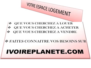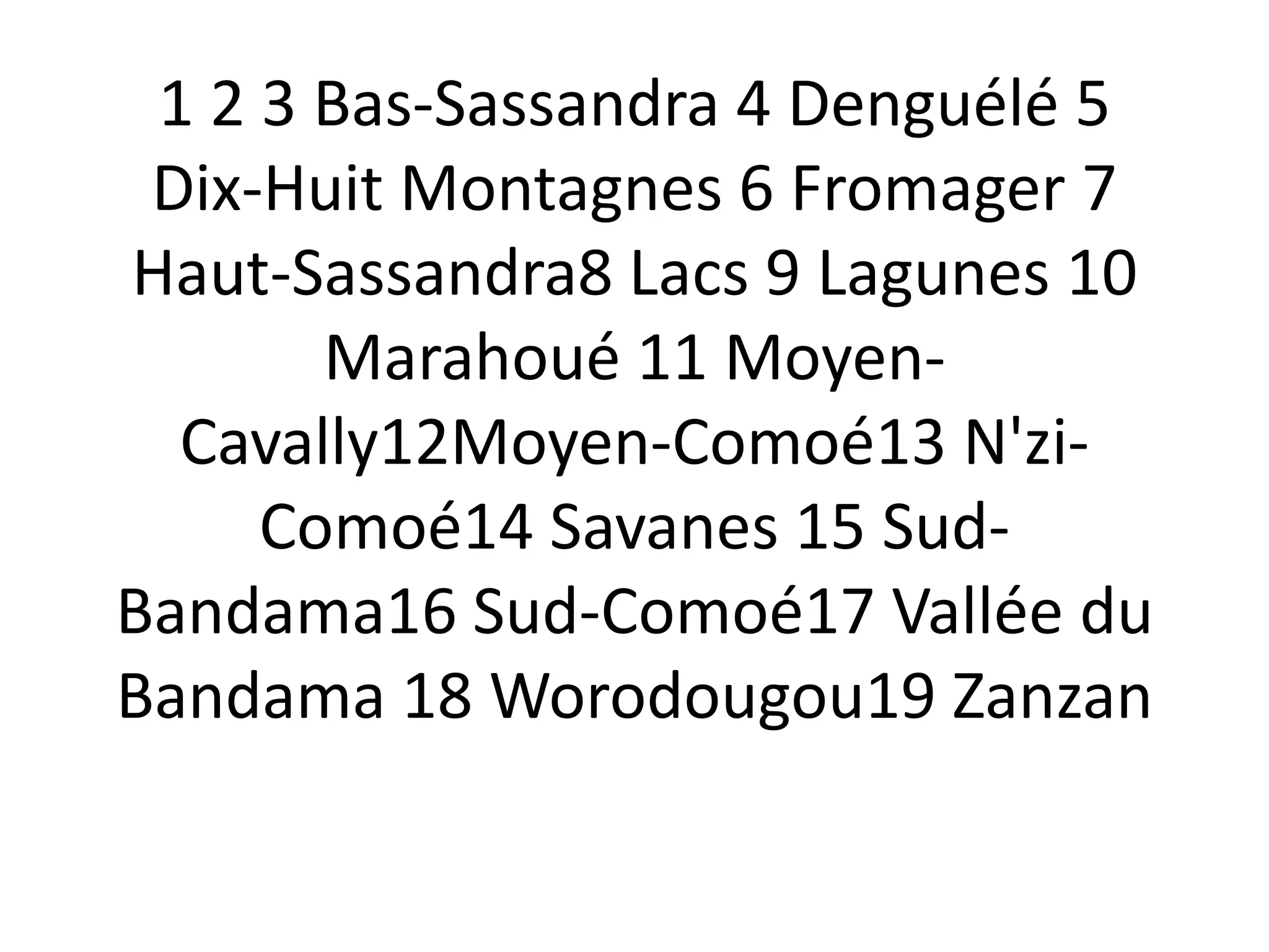 Das Dokument beschreibt verschiedene geographische Regionen und Merkmale in der Côte d'Ivoire, darunter die Regionen Bas-Sassandra, Moyen-Cavally, Moyen-Comoe, und Zanzan. Es nennt spezifische geographische Merkmale wie Berge, Seen und Lagunen. Außerdem wird darauf hingewiesen, die Aktivitäten dieser Regionen auf der Plattform ivoireplanete.com bekannt zu machen.