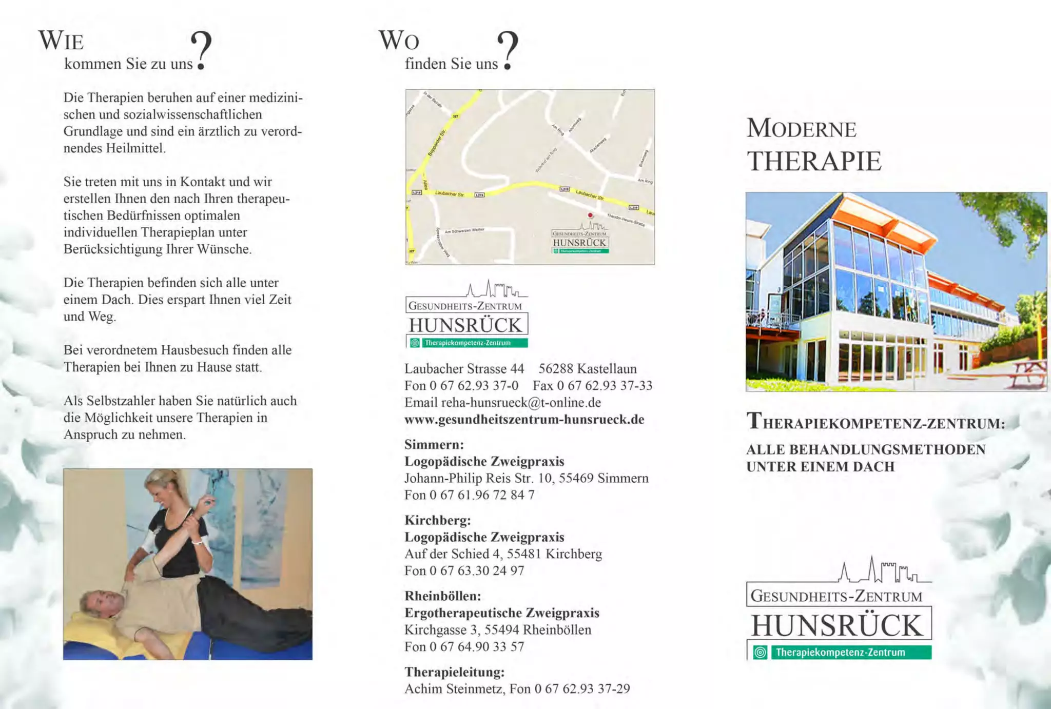 Das Dokument beschreibt die Dienstleistungen des Therapiekompetenzzentrums Hunsrück, das eine Vielzahl von medizinischen Therapien unter einem Dach anbietet, darunter Physiotherapie, Ergotherapie und Logopädie für Patienten aller Altersgruppen. Es betont die Wichtigkeit einer interdisziplinären Zusammenarbeit und bietet sowohl ambulante als auch hausbesuchende Therapien an, um die Genesung der Patienten zu unterstützen. Zudem wird auf die barrierefreie Zugänglichkeit und moderne Ausstattung der Einrichtung hingewiesen.