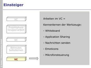 Das Dokument beschreibt verschiedene Ansätze und Beispiele für Online-Meetings und Trainings zur Effizienzsteigerung in Unternehmen, insbesondere im Facility Management und IT-Sektor. Es betont die Notwendigkeit enger Kooperation und standardisierbarer Prozesse sowie die Einführung des Microsoft SharePoint Servers zur Verbesserung der Online-Zusammenarbeit. Zusätzlich werden die Phasen der Planung und Durchführung von Workshops und Seminaren erläutert, einschließlich der Evaluation der Ergebnisse.