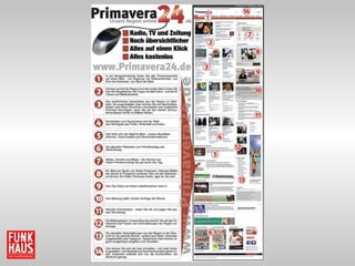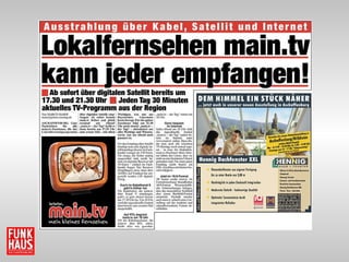 Das Dokument beschreibt die Medienlandschaft in Aschaffenburg, einschließlich der Vielzahl an Zeitungen, Radio- und Fernsehsendern. Es hebt die Entwicklung der Zuschauerzahlen von 67.000 im Jahr 2008 auf 123.000 im Jahr 2010 hervor, was einem Anstieg von 84 % entspricht. Die Aktivitäten der Funkhaus Aschaffenburg GmbH & Co Studiobetriebs KG werden in Bezug auf verschiedene Medienformate und Promotions vorgestellt.