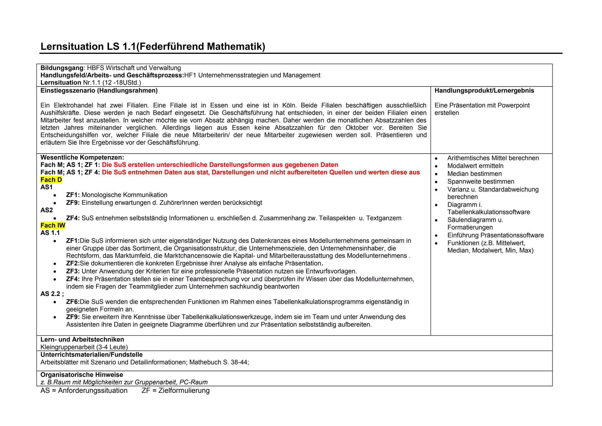 Das Dokument beschreibt eine Lernsituation im Fach Mathematik, in der Schüler die monatlichen Absatzzahlen zweier Filialen eines Elektrohandels analysieren, um zu entscheiden, wo ein neuer Mitarbeiter eingestellt werden soll. Die Schüler sind gefordert, Entscheidungsgrundlagen zu erarbeiten und diese in einer PowerPoint-Präsentation vor der Geschäftsführung zu präsentieren. Ziel ist es, verschiedene Datenanalyse-Techniken und Präsentationskompetenzen zu entwickeln.